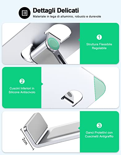 【Ultra Robusto】 Il supporto per laptop in lega di alluminio è più robusto e può contenere fino a 8,8 libbre (4kg). La sua superficie piatta e due ganci sono progettati con strisce antiscivolo e nella parte inferiore sono presenti 4 cuscinetti in silicone antiscivolo per mantenere il computer stabile e stabile.