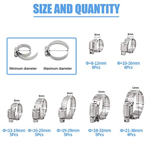 Glarks - Set di 40 fascette stringitubo, in acciaio inox 304, regolabili, gamma 8-38 mm, kit assortito, morsetti per tubo dell'acqua, per applicazioni idrauliche, automobilistiche e meccaniche