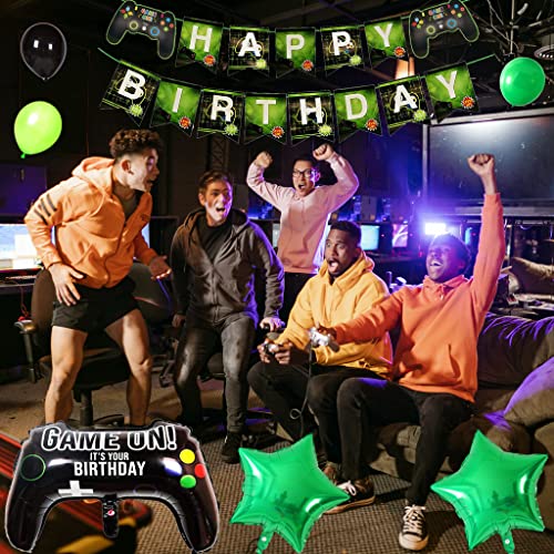 La confezione include: 1 palloncino con numeri (32 in), 2 palloncini con controller di gioco (circa 25 in), 2 palloncini a stella (18 in), 1 striscione Happy Birthday, 18 palloncini (nero, verde, verde chiaro), nastro (10 m) e punto adesivo.