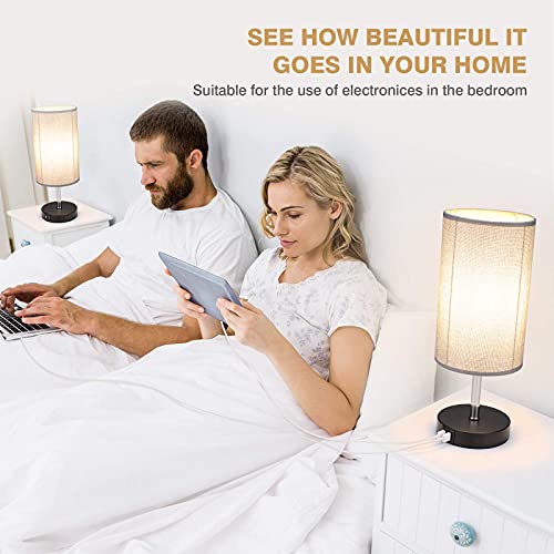 Glighone Lampada da Comodino con Controllo Touch, Dimmerabile Lampada da Tavolo con Porte di Ricarica USB e Paralume in Tessuto per Camera, Soggiorno, Caffetteria, Ufficio( Lampadine Inclusa, grigio)