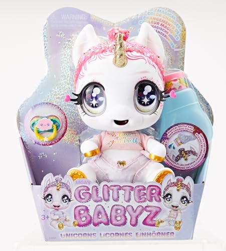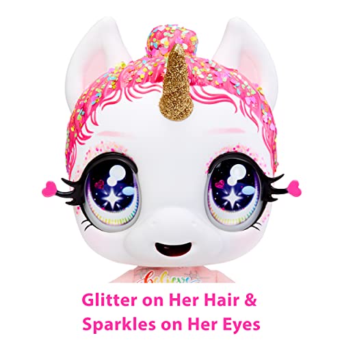 Glitter Babyz MGA Unicorn Baby Bambolina - LUNITA SKY - Cambia colore, capelli rosa glitterati, maglietta «Believe in Yourself», pannolino, bottiglia e ciuccio - Età: 3+ anni