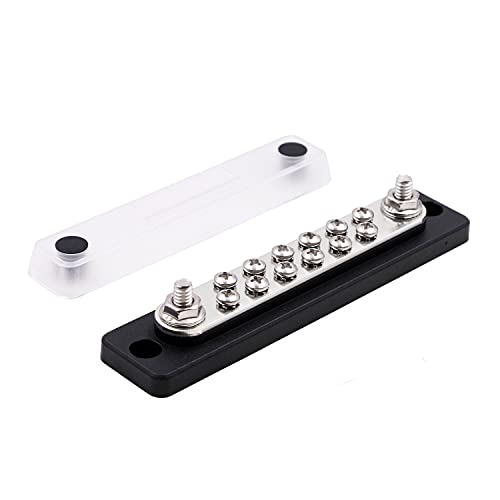 Mini busbar da 150 Amp con 12 terminali da #8-32 e 2 perni da 1/4"-20, blocco di distribuzione con coperchio trasparente.