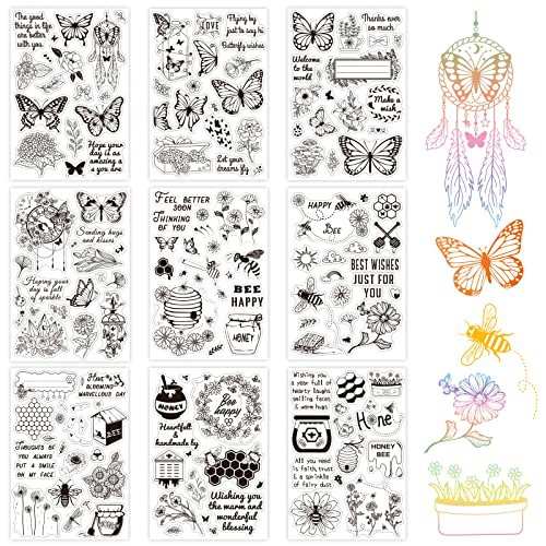 Timbri trasparenti Flower Butterfly: 9 foglio di timbri trasparenti con vari motivi carini, come la farfalla, fiori, ape, eccetera. Adatto per la decorazione di album di ritagli e la creazione di biglietti. Ogni foglio misura circa 16x11 cm,6.3x4.3 pollici.