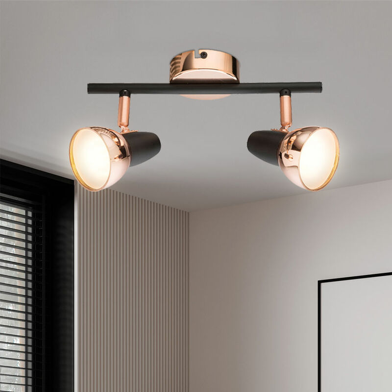 Descrizione Plafoniera di alta qualità con faretti mobili. Questa lampada convince con la sua accattivante combinazione di colori di colori rame con accenti neri opachi. Grazie all'aspetto elegante, può essere integrato in quasi tutti gli spazi abitativi. Grazie ai due punti mobili, la lampada può essere perfettamente allineata per illuminare in modo ottimale l'area selezionata. Le lampadine a LED sono installate in modo permanente nella lampada.Particolare lampada • Tipo di lampada: plafoniera • Materiale: alluminio, plastica • Colore: rame, nero • faretti mobili • Altezza x lunghezza in cm: 14,5 x 25 • Sorgente luminosa: 2x LED • Lampadina inclusa: sì • Potenza della lampada: 2x 4 watt • Colore della luce: bianco caldo • Flusso luminoso: 2x 250 lumen • Tensione di funzionamento: 126V Dettagli lampadine • Attacco: LED • Forma: sfera (bianco-opale) • Materiale: plastica • Flusso luminoso: 250 lm (lumen) • Consumo energetico: 4 kWh/1000h • Temperatura colore: 3000 K (Kelvin) • Colore