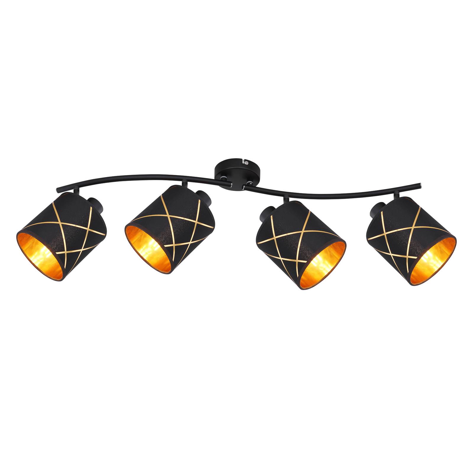 Stupefacente lampada da soffitto Bemmo in ferro e tessuto con quattro paralumi cilindrici Il faretto da soffitto Bemmo convince con il suo contrasto di colori e il suo design moderno. Si trova su un supporto rotondo da soffitto a cui è attaccato un montante curvo che porta quattro paralumi. Il corpo dell'apparecchio è mantenuto in un nero intenso, mentre i lati esterni delle tonalità hanno punzonature dorate a forma di linea e i lati interni sono completamente rivestiti in oro. La lampada da soffitto Bemmo può essere dotata di fonti di luce appropriate in modo che il colore e l'intensità della luce possano essere scelti liberamente. Per un quadro generale armonioso, la lampada da soffitto Bemmo può essere combinata con altre lampade della sua serie.