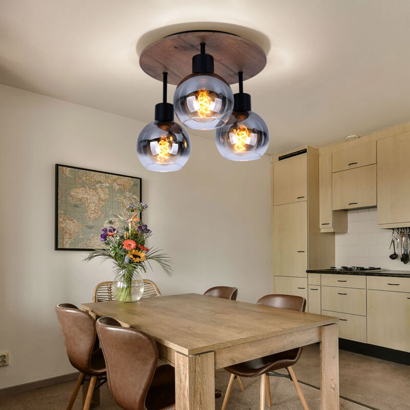 Descrizione Questa bellissima plafoniera colpisce per il suo fantastico design. Tre corte aste metalliche, ciascuna con attacco E27, ciascuna con paralume in vetro fumè, sporgono da una plafoniera rotonda (Ø38cm). Le prese E27 ti consentono di decidere tu stesso il colore e l'intensità della luce fino a una potenza massima di 40 watt. La lampadina non è inclusa nella fornitura. Particolare lampada • Tipo di lampada: plafoniera • Materiale: metallo, MDF, vetro • Colore: nero, marrone, fumé • Classe di protezione: 2 • Grado di protezione: IP20 • Diametro attacco a soffitto in cm: 28 • Diametro paralume in cm: 15 • Diametro x altezza in cm: 38 x 30 • Prese: 3x E27 • Lampadina inclusa: No • Potenza della lampadina: massimo 3x 40 watt • Alimentazione: 230V, 50Hz