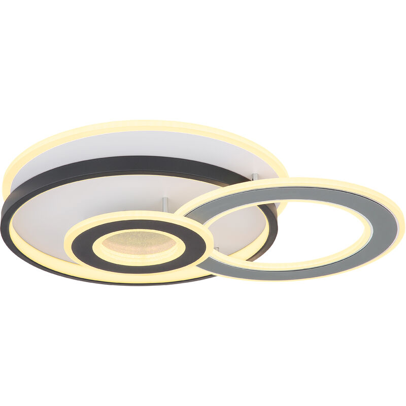 Questa lampada da soffitto della serie BRIENNA è composta da una struttura in metallo nei colori bianco opaco e grigio, oltre a un paralume in acrilico opalino e da un elemento in alluminio nero opaco. Il disco decorativo ha un effetto "sabbia di cristallo" ed è realizzato in acrilico trasparente. Le dimensioni della lampada sono 520x430x80mm. È dotato di una lampadina a LED con una potenza di 40W a 230V e ha una potenza luminosa di sorgente di 4900lm e uscita di 2100lm ad una temperatura di colore di 3000K.