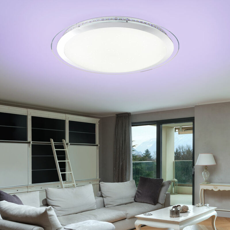 Descrizione Questa straordinaria lampada da soffitto rotonda in cromo colpisce per le sue numerose funzioni. Questo fantastico modello è dotato di un telecomando che abilita molte funzioni come: B. un cambia colore e un fissatore di colore. Il paralume dall'aspetto discreto ha un diametro di 55 cm ed è decorato con una decorazione glitterata, che crea un effetto stella. Questa plafoniera dimmerabile fornisce un massimo di 3300 lumen di luce. Una sorgente luminosa LED RGB è installata in modo permanente nella lampada. Lampada dettagli • Tipo di luce: plafoniera • Materiale: metallo, cromo • Paralume: acrilico, opale • Circuito CCT (3000-6000K) • Controllo remoto • Cambia colore • dimmerabile • Diametro x altezza in cm: 55x10 • Sorgente luminosa: 1x scheda LED RGB • Lampadine incluse: sì • Potenza lampada: 60 watt • Flusso luminoso: 3300 lumen • Temperatura del colore: 3000 - 6000 Kelvin • Colore della luce: bianco caldo - bianco freddo • Alimentazione: da 220 V a 240 V, da 50 Hz a 60