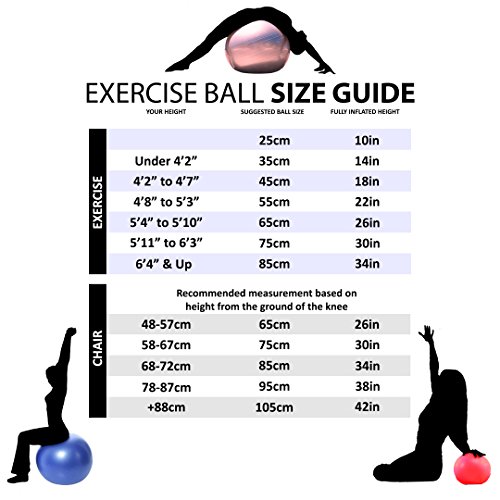 DIMENSIONI PALLA: Quando si acquista una palla da palestra / palla da ufficio, in particolare le sue dimensioni o il diametro della palla è decisivo. La dimensione della palla dovrebbe sempre essere basata sulla tua altezza. Quando si è seduti sulla palla, le cosce devono essere orizzontali, con le gambe inferiori a un angolo di 90 gradi ed entrambi i piedi toccano il suolo. Dimensioni disponibili: 25 cm, 35 cm, 45 cm, 55 cm (156-165 cm), 65 cm (166-178 cm), 75 cm (178-188 cm) / 85 cm (oltre 190