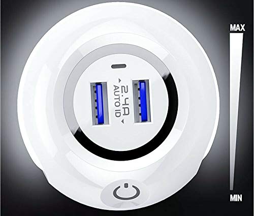 Caricabatterie dotato di doppia porta USB e luce a LED. Questa presa a muro e a doppia funzione, può essere usata come una comoda luce notturna con pulsante a touch per accendere o spegnere o regolare l'intensità luminosa, e allo stesso tempo può ricaricare due dispositivi contemporaneamente con le due prese USB entrambe con un output di 5V 2,4A e una potenza di 17W. Caratteristiche: