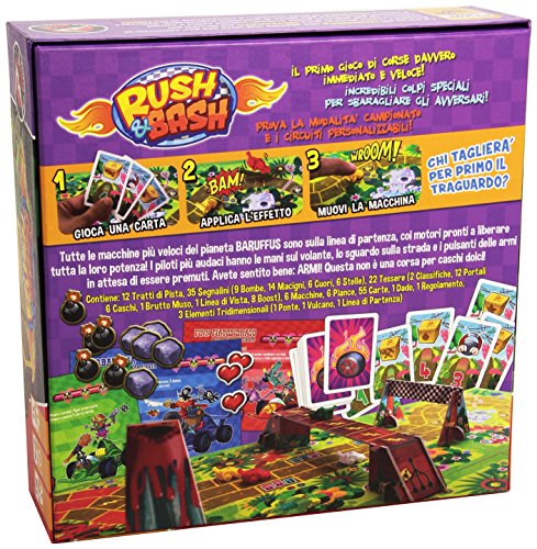 Contenuto: 12 tratti di pista, 35 segnalini, 22 tessere, 6 macchine, 6 plance, 55 carte, 1 dado, 1 regolamento, 3 elementi tridimensionali.