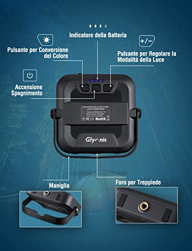 Glymnis Lampada Campeggio Power Bank 5000 mAh, 1000LM Lampada Lavoro Ricaricabili, Faro LED con 5 modalità di luce, per tenda, campeggio, uragano, escursionismo, emergenza, interruzione