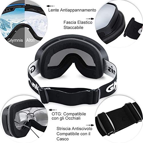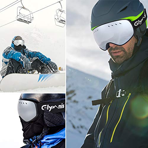 Glymnis Maschera da Sci Occhiali da Sci OTG Super-grandangolo Occhiali da Snowboard e Staccabile Lenti Antiappannamento Antivento di Protezione UV400 per Uomo e Donna (Argento-Lente Mercurio)
