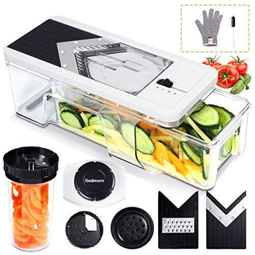 Godmorn Ajustable Cortadora de verduras Mandolina Cuchilla en V Mandolina Trituradora con contenedor de cajones, Rebanadora de 5 intercambios, Rallador, Juliana, Cinta y cuchillas en Espiral