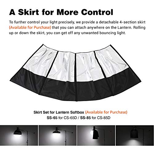 Una gonna per un maggiore controllo: per controllare ulteriormente la tua luce con precisione, forniamo una gonna staccabile a 4 sezioni (disponibile per l'acquisto) che puoi attaccare ovunque sul softbox. Arrotolando su e giù per la gonna, puoi scendere da qualsiasi luce rimbalzante indesiderata.
