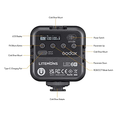 Godox LITEMONS LED6R Luce video LED RGB Mini luce di riempimento ricaricabile 3200K-6500K Dimmerabile 13 effetti di luce Supporto adsorbimento magnetico con 3 supporti per scarpe fredde