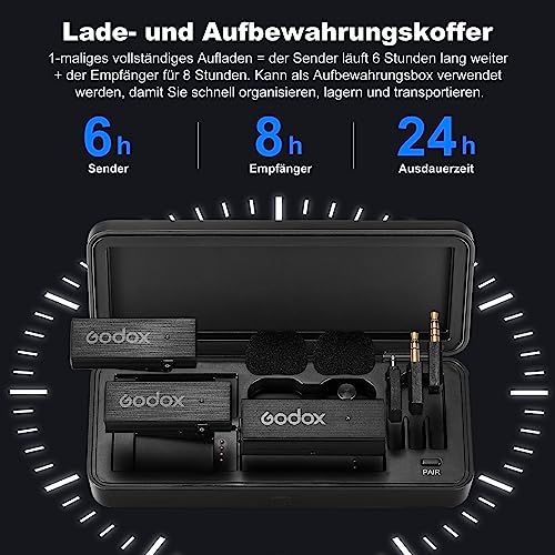 GODOX Movelink Mini LT Kit 2 Microfono Lavalier Wireless,2.4GHz 100m Lapel Mic Senza Fili-2 TX+ 1 RX con custodia di ricarica per iPhone,PC,Lightning,Smartphone,Fotocamera,Vlog,Interviste(Nero)