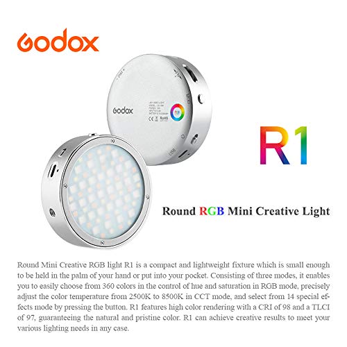 Godox R1 LED RGB Round Mini Creative Light,14 effetti di illuminazione FX, con modalità musica creativa, installazione rapida magnetica, eccellente struttura a conchiglia in alluminio (argento)