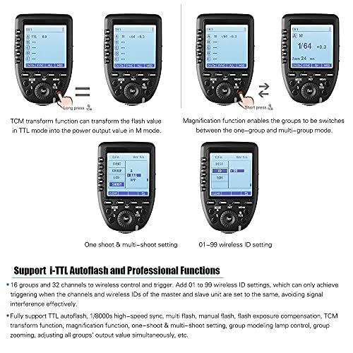 Supporta completamente il flash automatico TTL, sincronizzazione ad 1 / 8000s ad alta velocità, flash multiplo, flash manuale, compensazione dell'esposizione flash, funzione di trasformazione TCM, funzione di ingrandimento, impostazione one-shoot e multi-shoot, controllo della lampada di modellazione di gruppo, zoom di gruppo, regolazione di tutti i gruppi 'valore di uscita simultaneamente, ecc.