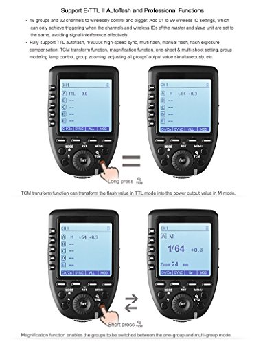 Supporto completo per flash automatico TTL, sincronizzazione ad alta velocità (1/8000 s), multi flash, flash manuale, flash con compensazione dell'esposizione, funzione di trasformazione TCM, funzione di ingrandimento, impostazione per uno scatto e multiscatto, gruppo di controllo per lampada pilota, gruppo zoom, regolazione del valore di uscita di tutti i gruppi contemporaneamente, ecc.