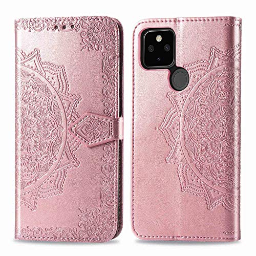 GOGME Cover per Google Pixel 4a 5G Cover, Custodia Chiusura Magnetica Flip Case Stile, Pelle PU Mandala Sbalzato con Supporto di Stand/Carte Slot. Oro Rosa