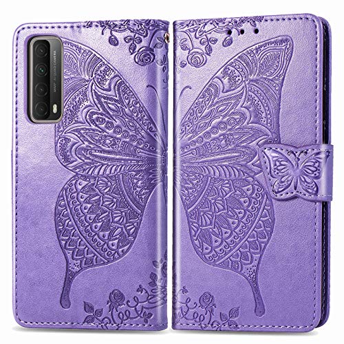 GOGME Cover per Huawei P Smart 2021 Cover, Custodia Chiusura Magnetica Flip Case Stile, Pelle PU Farfalla Sbalzato con Supporto di Stand/Carte Slot. Viola Chiaro