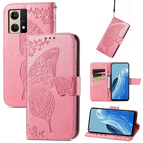 GOGME Cover per Oppo Reno7 (Reno 7) Cover, Custodia Chiusura Magnetica Flip Case Stile, Pelle PU/TPU Farfalla Sbalzato con Supporto di Stand/Carte Slot. Rosa