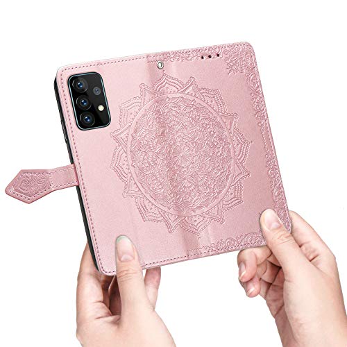 GOGME Cover per Samsung Galaxy A52 4G/A52 5G/A52s 5G Cover, Custodia Chiusura Magnetica Flip Case Stile, Pelle PU/TPU Mandala Sbalzato con Supporto di Stand/Carte Slot. Oro Rosa