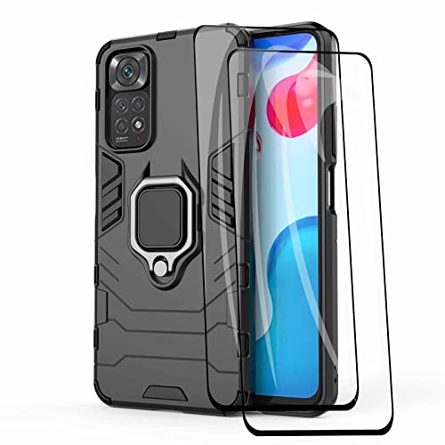 GOGME Cover per Xiaomi Redmi Note 11S | Note 11 4G + 2 Vetro Temperato, Armor Custodia con 360 Gradi Girevole Anello, Silicone TPU e PC AntiGraffio Protettiva Bumper Case. Nero