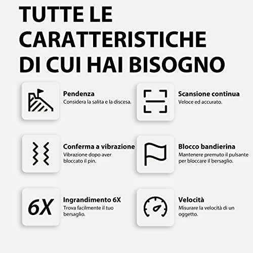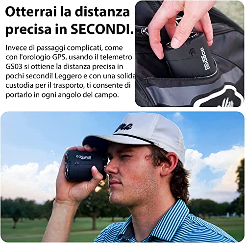 MODALITÀ DI GOLF ECCELLENTI - Questo nuovo telemetro da golf GS03 è dotato della tecnologia di telemetro da golf più avanzata. La tecnologia di blocco del pin e bandierina ti fa sapere l'esatta distanza per colpire. E quando si blocca il bersaglio, la tecnologia di vibrazione vibra per ricordarlo e i dati appariranno chiaramente davanti ai tuoi occhi. Ultimo, ma non meno importante, la funzione molto utile di correzione della distanza in pendenza, ti aiuterà a colpire alla giusta distanza.