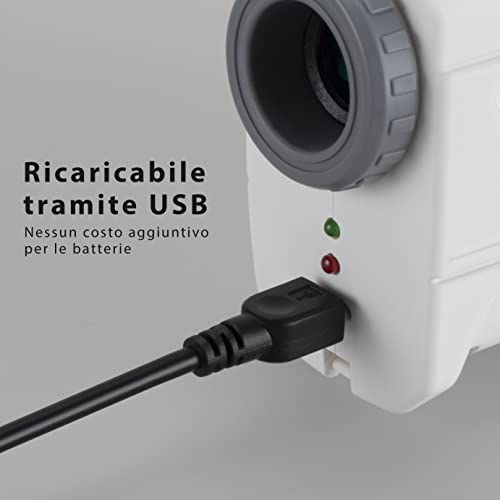 【DESIGN UNICO E RICARICA DELLA BATTERIA USB】 Il nostro telemetro da golf con ottica chiara, dimensioni 106x 72 x 40 mm e peso 184g, perfetto da portare durante il golf o la caccia, corpo resistente, motivo a vernice stellata. Aspetto aerodinamico. Design in gomma antiscivolo e diverso dagli altri con batteria al litio ricaricabile esterna da 3,7 V 900 mAh, questo utilizza una batteria ricaricabile integrata per il dispositivo.