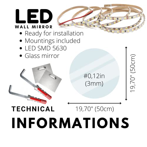 Specifiche: 50 x 50 cm. Spessore specchio: 3 mm. Il prodotto può essere alimentato da un interruttore a parete o tramite un cavo con spina.
