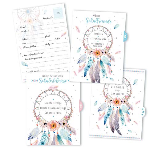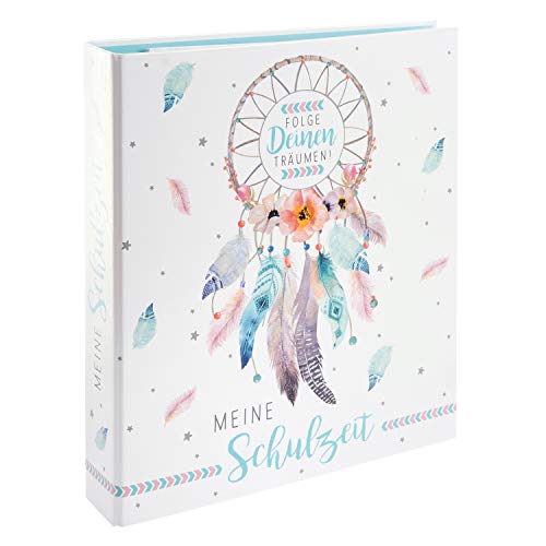 La robusta cover è dotata di un motivo colorato di Dreamcatcher e con la scritta "Meine Schulzeit Schulzeit (lingua italiana non garantita), ideale per la conservazione di documenti scolastici e certificati.