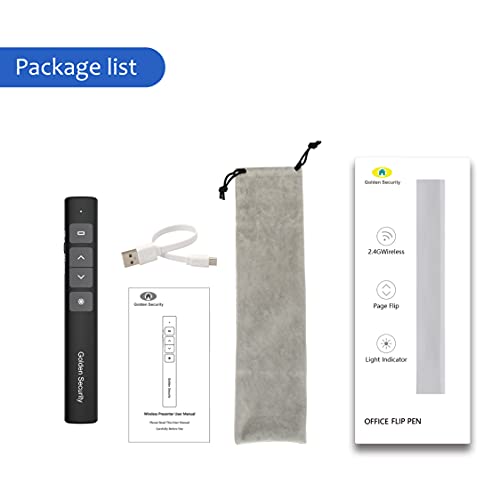 Golden Security Wireless Presenter, penna a vibrazione per ufficio RF da 2,4 GHz, distanza del telecomando di 328 piedi, collegamento ipertestuale e supporto per la ricarica USB (nero)
