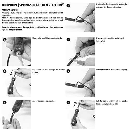 SALTA COME UN PRO: una lunghezza della corda ottimale è essenziale per un allenamento adeguato. Nella corda per saltare Golden Stallion, il cordoncino di cuoio può essere tagliato facilmente a seconda della propria statura permettendo un maggior comfort e risultati di allenamento perfetti durante il salto.