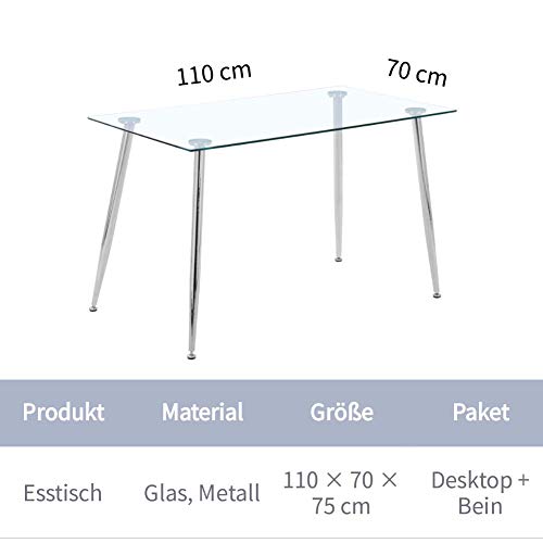 GOLDFAN Tavolo da pranzo in vetro Tavolo rettangolare in vetro Tavolo da pranzo per cucina e soggiorno con gambe in metallo, argento...