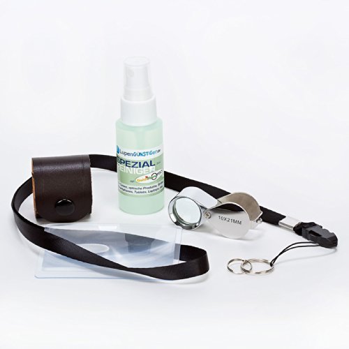 Goldiflora Optics MG 55367 - Lente d'ingrandimento con custodia in pelle per lente, 10x di ingrandimento, diametro lente: 21mm, inclusiva di batterie, panno in microfibra, flacone di detergente specifico, custodia protettiva adatta anche ad altre lenti e occhiali