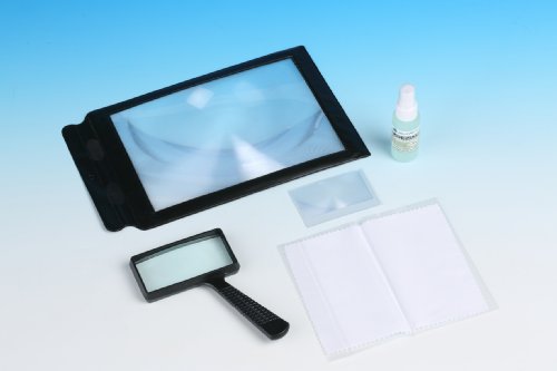 Goldiflora Optics MG 8D026 - Set di lenti d'ingrandimento, con lente a pellicola con ingrandimento di 3x, diametro: 300 mm x 195 mm, materiale: PVC e lente a mano con lente di vetro da ca. 2,5x, diametro: 100 x 50 mm, accessori inclusi: 1 panno in microfibra, 1 lente per assegni (ingrandimento: 2x), 1 lente da appendere (ingrandimento: 2x)