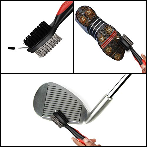 SPAZZOLA PER SCARPE GOLF: La nostra spazzola pulizia e accessori scarpe da golf è dotata di una spazzola a due teste ed una punta per la pulizia. È lunga 20 cm con 3,5 cm per ogni spazzolino con uno spessore di 1,2 cm. Le setole sono progettate per pulire legni (compresi legni da fairway e driver) ibridi e ferri. L'impugnatura è progettata ergonomicamente per adattarsi alla forma della tua mano per una pulizia più efficace. Sarebbe un ottimo regalo per un appassionato giocatore di golf.
