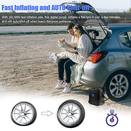VELOCITA' DI INFRAZIONE VELOCE Questa ad aria elettrica digitale è dotata di un motore turbo in puro rame, è più potente, stabile e durevole. La portata massima del flusso d'aria è di 30 l/min, può gonfiare un pneumatico auto 195/65R15 in pochi minuti da 0 a 35 psi, rendendo il gonfiaggio dei pneumatici in caso di emergenza più facile e conveniente di una pompa tradizionale.