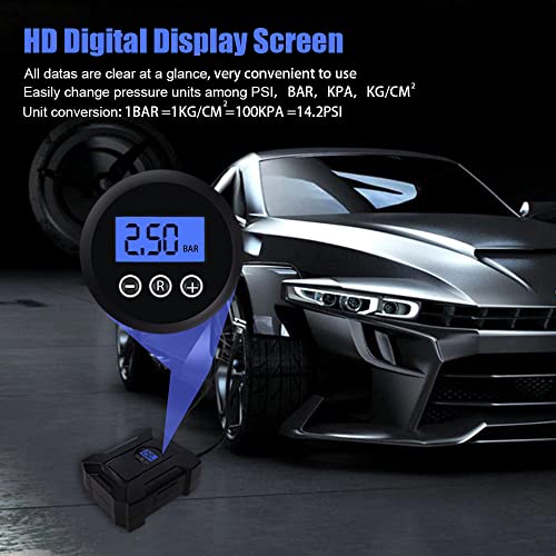 Display LCD e torcia tascabile a LED: i compressori d'aria portatili da 12 V sono dotati di un display LCD digitale ad alta precisione, tutte le informazioni sono chiare a colpo d'occhio, è possibile cambiare facilmente le unità di pressione tra PSI, BAR, KPA, KG/CM² e preimpostare il valore di pressione. Questa per pneumatici per auto ha anche una torcia a LED luminosa per le emergenze, che rende il gonfiaggio o la di un'auto di notte più facile e sicura.