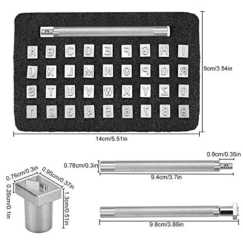 【26 lettere e 10 numeri】Ogni confezione include una maniglia e 36 timbri (Alfabeto A-Z e numeri 0-9). Dimensioni: 98 mm di lunghezza complessiva, il timbro misura 13 mm x 9,5 mm x 7,6 mm con lettere/numeri da 6,5 mm. È come si vede nella foto.