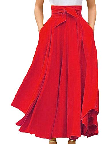 Gonna lunga da donna con elastico in vita e gonna a pieghe a vita alta casual, Rosso, S