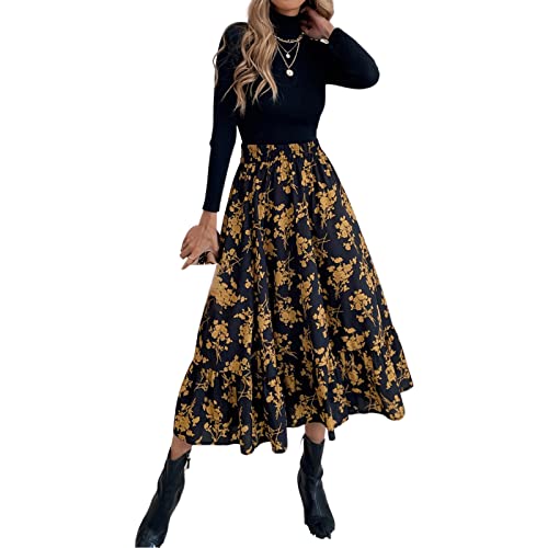 Gonna Lunga da Donna con Motivo Floreale/Leopardo Dress Elastico Svasato a Vita Alta a Pieghe Linea A Gonne alla Moda Classico Semplice Casual Adulta per Festa Danza (Nero Floreale, XL)