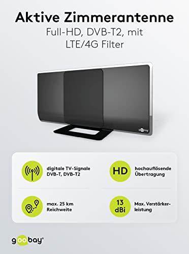 Goobay 67179 Antenna omnidirezionale da interno Full HD / Antenna attiva con amplificatore HDTV (DAB / DVB-T) Antenna DVB-T2 DIA 42 PS / Filtro LTE/4G / Interno / Nero