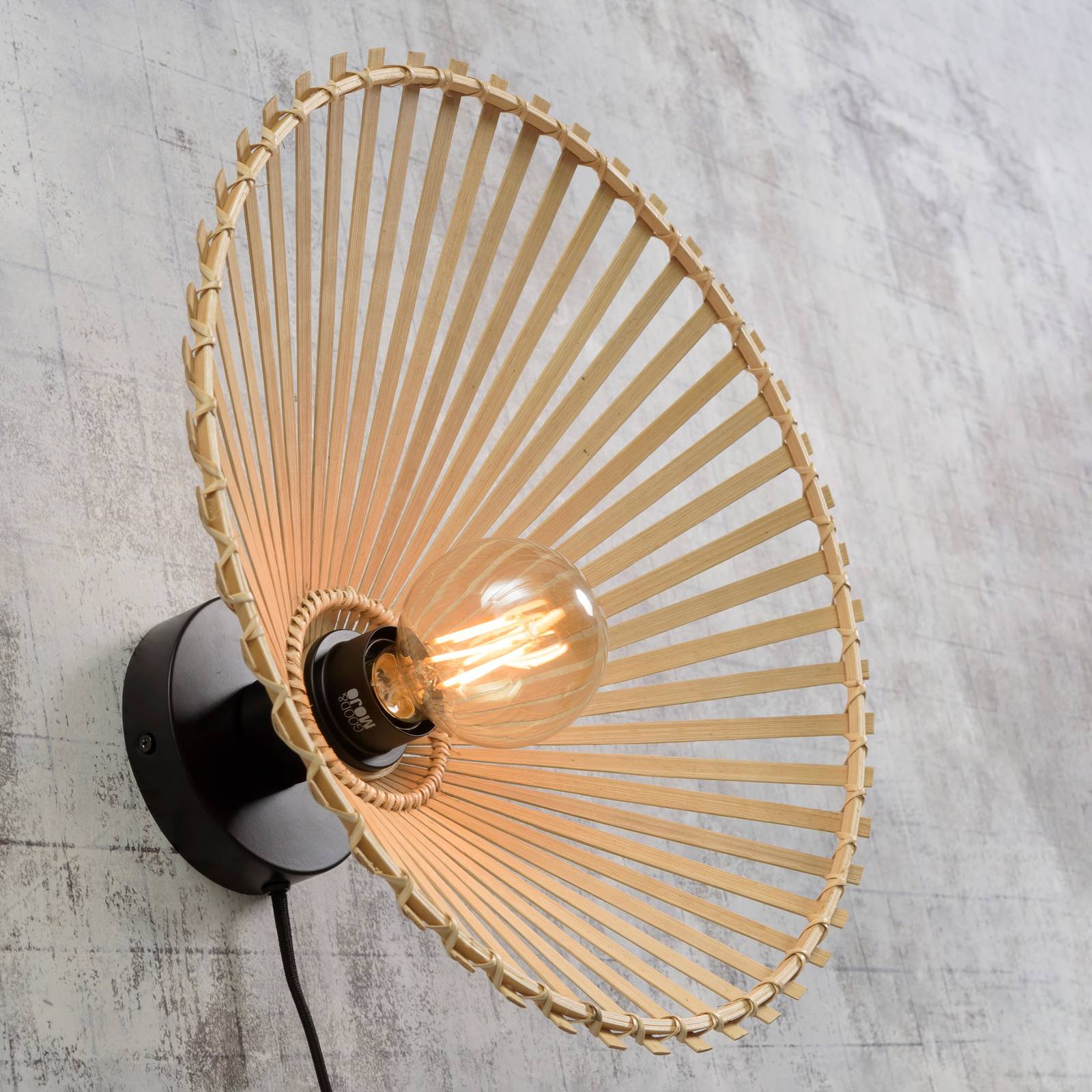 Lampada da parete asimmetrica Bromo in bambù, con interruttore Una staffa da parete rotonda e discreta in ferro forma la base della lampada da parete Bromo. Lì è integrata la presa, che è il centro di questa lampada speciale. Da questo centro, numerosi e sottili puntoni di bambù chiaro corrono parallelamente e uniformemente verso un cerchio esterno, che forma il bordo e quindi l'armoniosa finitura. Le forme contrastanti formano nel loro insieme un paralume rotondo e asimmetrico, leggermente curvato verso la parete, che integra e circonda la sorgente luminosa da utilizzare. Per creare un effetto di luce speciale, si consiglia di scegliere una lampada a specchio che emette la sua luce principalmente in direzione del muro e quindi brilla attraverso gli spazi tra i montanti, creando un motivo atmosferico sul muro. L'aspetto naturale di questa lampada da parete proviene principalmente dal materiale di bambù sostenibile da cui il paralume è completamente realizzato. Il bambù è estremamente forte e flessibile e ricresce molto rapidamente dopo essere stato tagliato. Fattori importanti per il marchio Good & Mojo. La loro gamma è composta da luci sostenibili e vive secondo il motto: "Quando compri la luce, dai la luce". Questo è realizzato attraverso la collaborazione con fondazioni caritatevoli come la WakaWakaFoundation, che utilizza le donazioni per fornire prodotti solari alle famiglie bisognose. O con la partnership con Eden Reforestation Projects, attraverso la quale viene piantato un albero per ogni luce venduta.