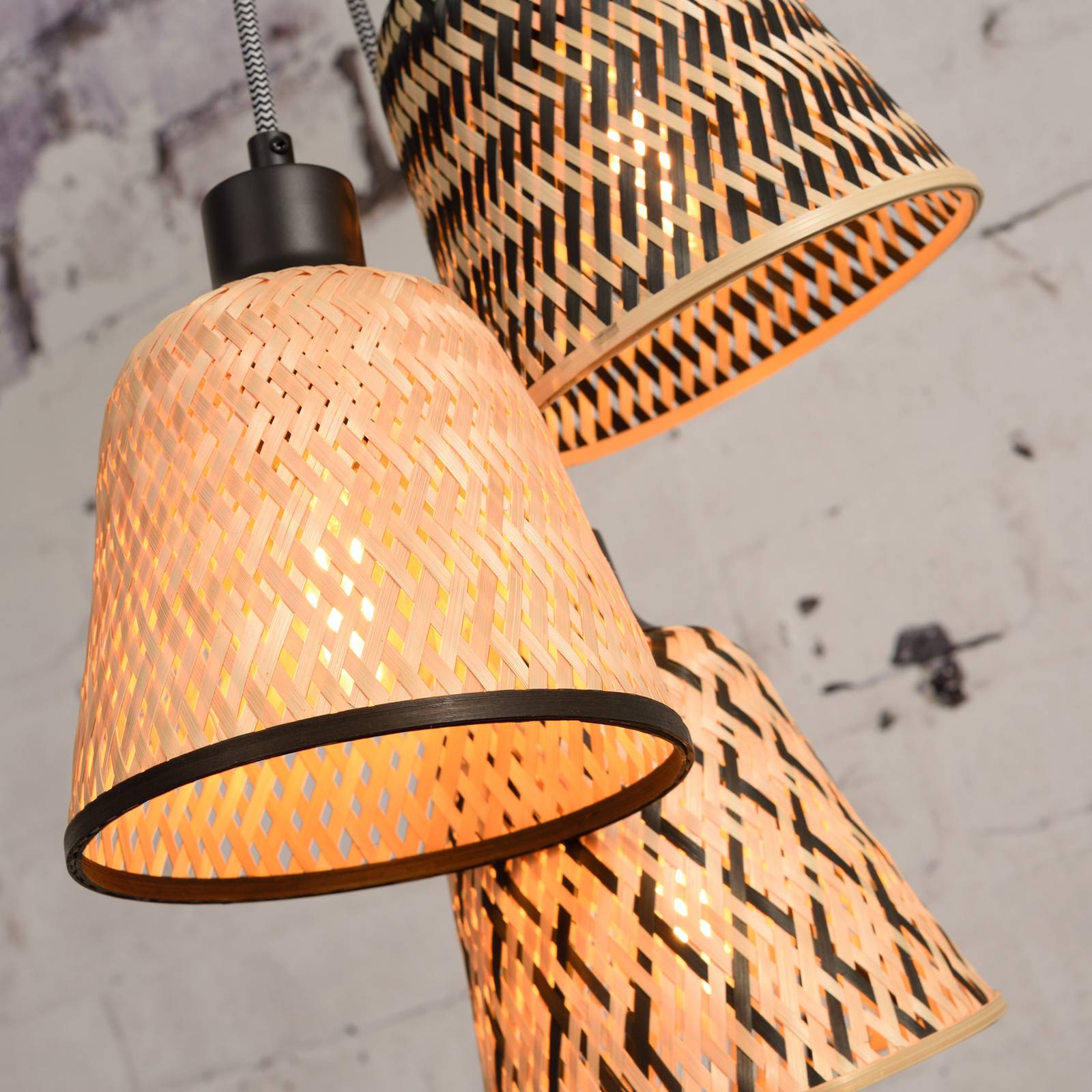 Apparecchio a sospensione a tre lampade in fascio Kalimantan Con tre tonalità sospese, la lampada a sospensione Kalimantan ispira con il suo look naturale ed emozionante. I paralumi sono tessuti in bambù e hanno una forma conica. Sono aperti nella parte inferiore, il che permette alla luce di uscire e illuminare direttamente. Tutt'intorno, un'atmosfera accogliente è creata dalla luce soffusa che brilla attraverso i modelli sottili. Dettagli speciali e accattivanti sono creati dall'uso di bambù nero e di colore naturale, che è lavorato nelle tonalità con motivi ponderati ed emana un aspetto naturale. Questo è armoniosamente completato da cavi tessili bianchi e neri integrati nel baldacchino nero. Il materiale di bambù utilizzato è considerato un prodotto sostenibile, poiché la pianta, quando viene tagliata, ricresce sempre di nuovo e soprattutto rapidamente, in modo che sia possibile un raccolto costante. È anche molto flessibile e produce molto ossigeno, motivo per cui il bambù è ideale per la collezione di illuminazione sostenibile sotto il marchio Good & Mojo dell'azienda olandese It's about Romi. Tra le altre cose, piantano un albero per ogni prodotto venduto e sostengono così la riforestazione nelle regioni colpite dalla povertà.