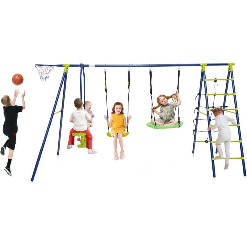 Informazioni su questo articolo # Parco giochi multifunzionale per giardino # Questo set di altalene include un'altalena a cestello, un'altalena a cintura, un'altalena a volo, una scala di arrampicata, una rete di arrampicata e un canestro da basket, garantendo che più bambini possano partecipare a una varietà di attività divertenti. È perfetto per accendere lo spirito avventuroso dei giovani esploratori. # 2 altalene con altezze regolabili # Entrambe le altalene hanno corde regolabili per mantenere le sedute all'altezza perfetta. L'altalena a cestello ha un'altezza minima della seduta di 40 cm, e l'altalena a cintura ha un'altezza minima della seduta di 35 cm, rendendole adatte a bambini di diverse età. # Costruzione stabile & design sicuro # La struttura a forma di A per le altalene è saldamente ancorata con picchetti per garantire massima sicurezza e stabilità. Inoltre, questo parco giochi all'aperto con una lavorazione di alta qualità lo rende una scelta affidabile per le