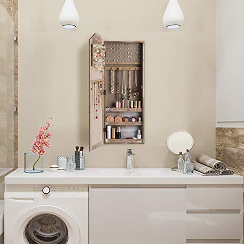 GOPLUS Armadietti Portagioie con Specchio, Sospeso a Muro/Porta, con Doppio Gancio, Sbarre per Gioielli, Scomparti Divisi, Stile Retrò, in Legno, 35x9,2x96 cm, Marrone