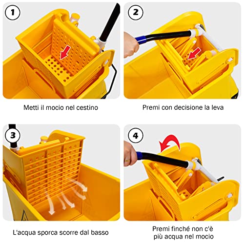 Grande capacità: Il nostro carrello di pulizia ha una capacità di 32 litri, può contenere molta acqua, quindi non è necessario cambiare l'acqua frequentemente. Inoltre, può essere utilizzato con una varietà di moci, il che può portare grande comodità al tuo lavoro.